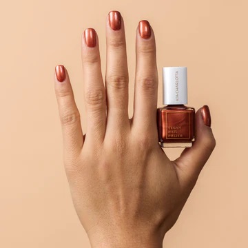 Intenzivní rezavě hnědý metalický odstín se zářivým povrchem již po jedné vrstvě. Lak na nehty Kia Charlotta z kolekce jaro / léto 2023.