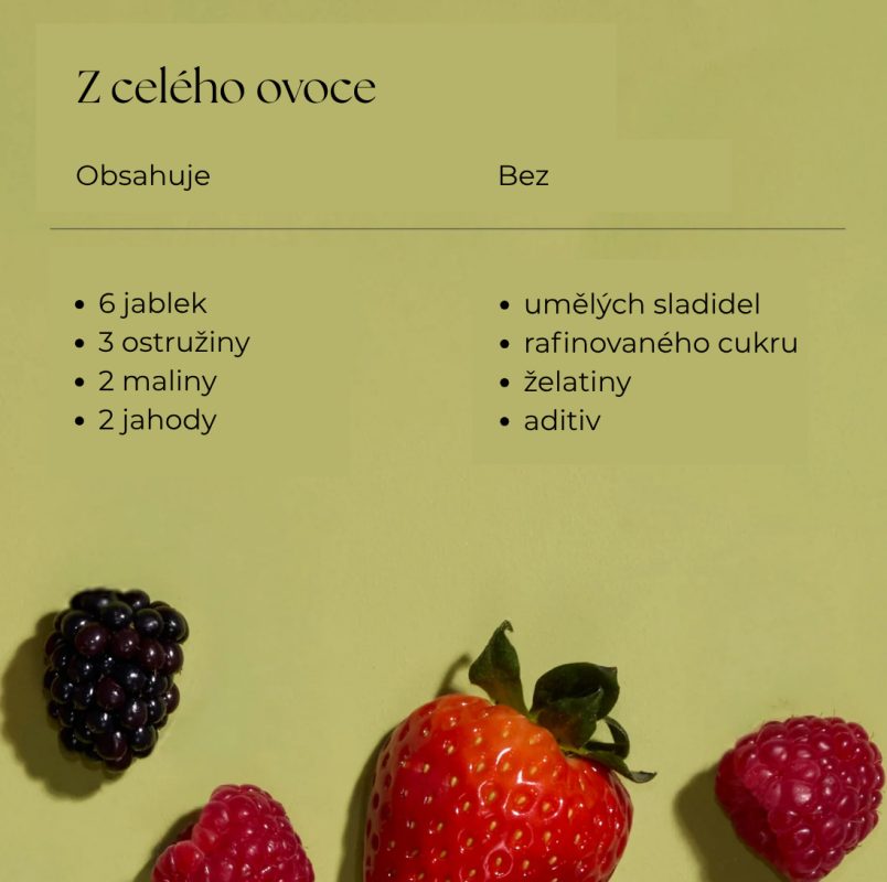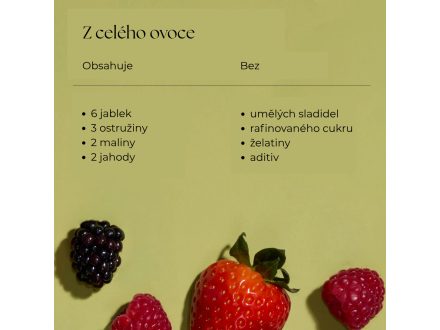 96 % ovoce (57,5 % jablečný koncentrát, 22,5 % jablečné pyré, 8 % jahodové pyré, 5 % ostružinové pyré a 3 % malinové pyré), želírující látka: pektin; koncentrát z černé mrkve, koncentrát z citronové šťávy; citrusová vláknina*, přírodní aroma a vitamin D3 (kapsle s cholekalciferolem)